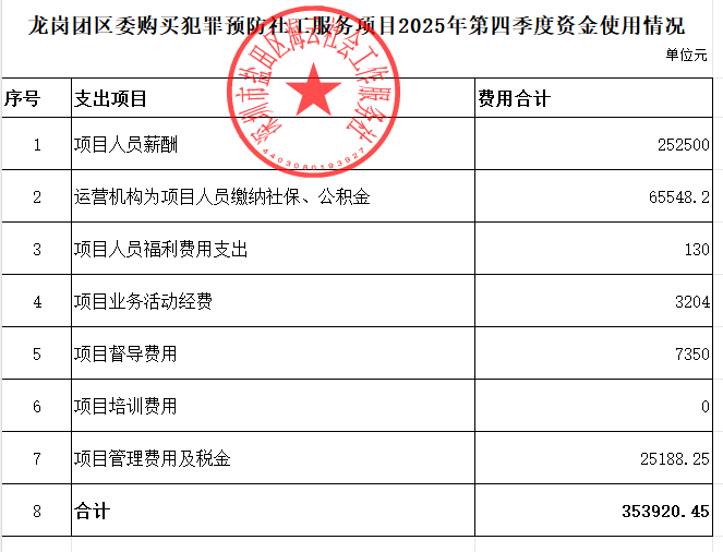 龙岗团区委购买犯罪预防社工服务项目2025年第四季度资金使用情况表