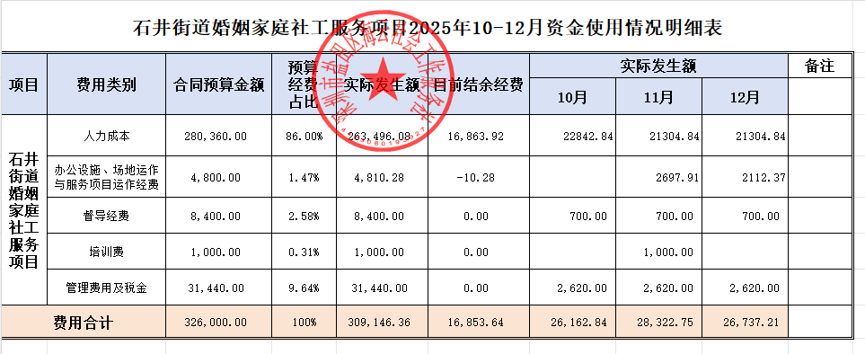 石井街道婚姻家庭社工服务项目2025年10-12月资金使用情况明细表