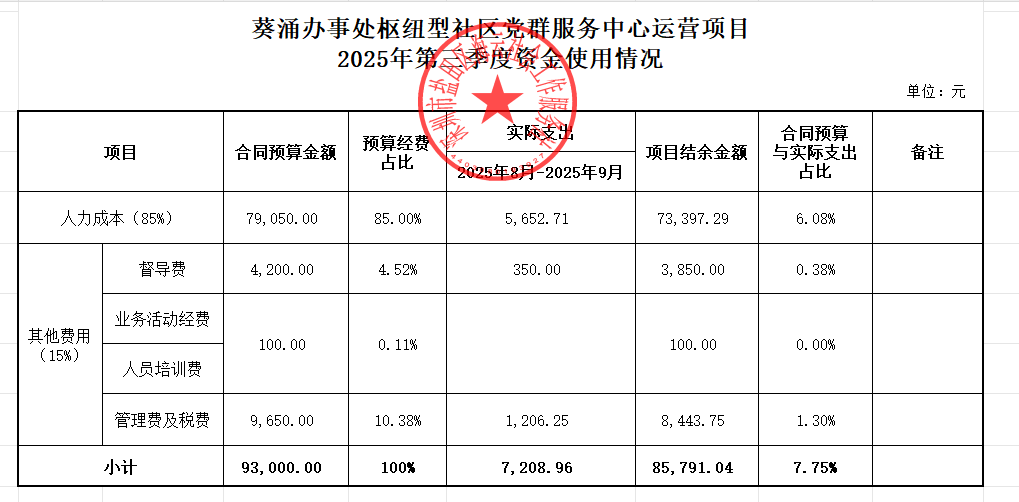 葵涌办事处枢纽型社区党群服务中心运营项目2025年第三季度资金使用情况