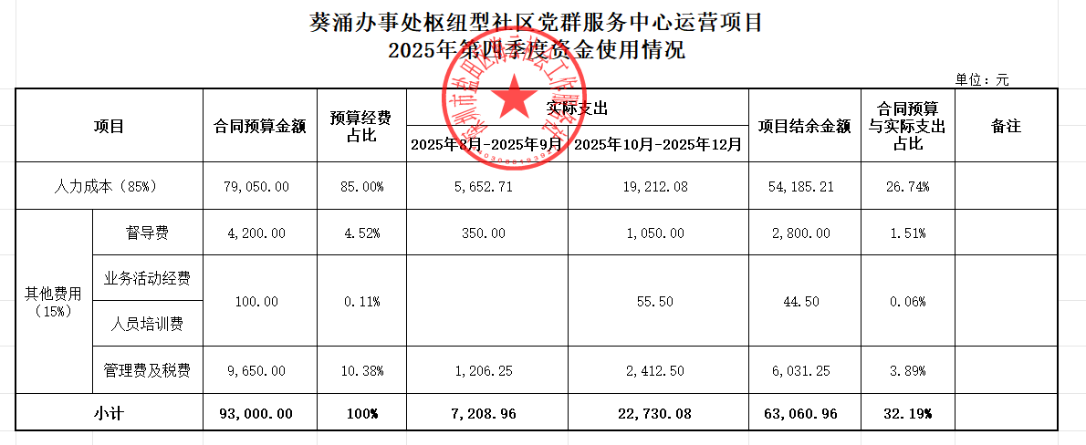 葵涌办事处枢纽型社区党群服务中心运营项目2025年第四季度资金使用情况
