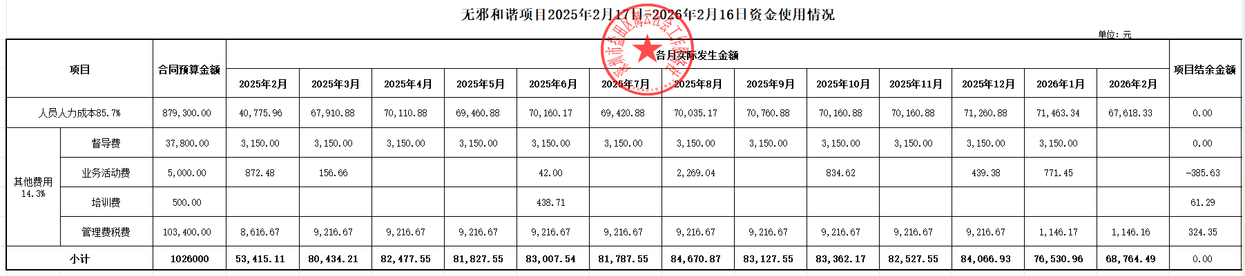 无邪和谐项目2025年2月17日-2026年2月16日资金使用情况